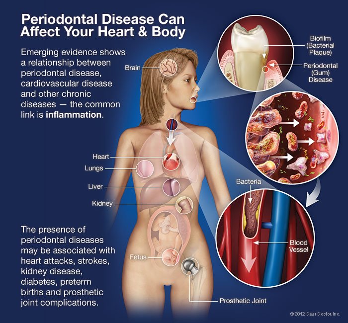 Periodontal disease starts in your mouth but has actually been linked to more serious conditions, such as cardio-vascular disease (CVD), diabetes and preterm births. Research has suggested two plausible mechanisms for how gum disease and these other serious medical concerns could be related: moderate to severe periodontal disease increases the level of systemic (bodily) inflammation — a characteristic of all chronic inflammatory diseases. Also, the same bacterial strains that are commonly found in periodontal pockets surrounding diseased teeth have been found in blood vessel plaques of individuals with CVD. Therefore, it may be helpful to reduce periodontal inflammation to reduce systemic inflammation.